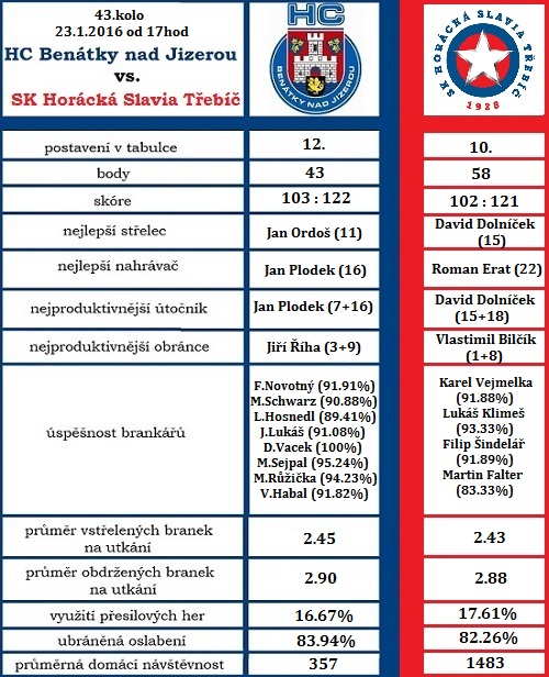 V posledním vzájemném měření sil Benátčanů a Třebíčanů byli úspěšnější Středočeši, kteří vítězstvím na venkovním kluzišti 2:1 po samostatných nájezdech ukončili tehdejší sérii šesti proher. Oba týmy od sebe momentálně dělí patnáct bodů v tabulce, ale i přesto Třebíč balancuje na hranici předkola play-off a play-out. V sobotu 23. 1. tak půjde o důležitý souboj, kdy si Benátky budou chtít udržet náskok na Šumperk a Most a naopak hosté z Moravy budou chtít získat body, které by je udržely v top 10. Úvodní buly bude vhozeno v 17 hodin, pokud nebudete moci být přítomni na stadionu, je pro vás tradičně připraven online komentář.