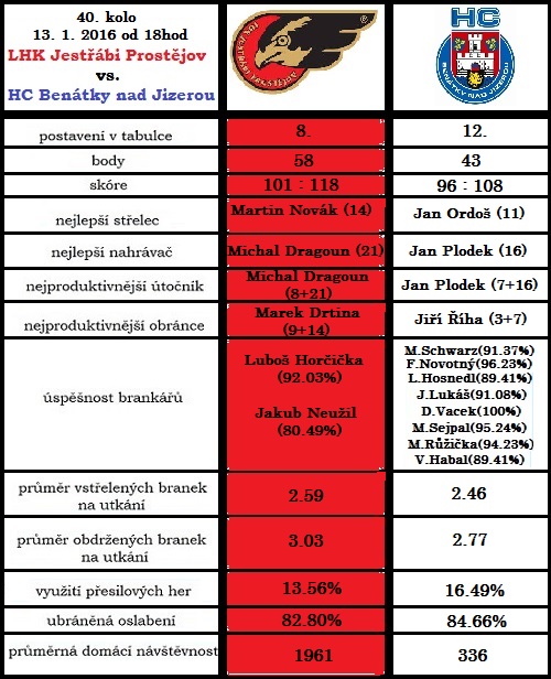S prostějovskými Jestřáby letos Benátky dokázaly jednou vyhrát. Byl to hned první vzájemný duel a to na ledě Benátčanů, kde svého soupeře udolali 1:0 po samostatných nájezdech. V dalších dvou utkáních ale uspěl Prostějov pokaždé stejným výsledkem 3:2. Moravané ale v roce 2016 ještě nevyhráli, zato Středočeši již dvakrát triumfovali. Nicméně Jestřábi nebyli daleko od vítězství v předešlém 39. kole, kdy hostili Kladno, ale v poslední minutě nastavení jim naději Rytíři ukradli. Ve středu 13. 1. můžete zápas sledovat tradičně online reportáží, úvodní buly bude vhozeno v 18 hodin.