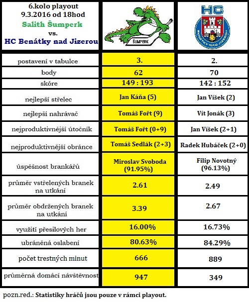 Ve středu 9. 3. čeká Benátky nad Jizerou závěrečný duel letošní sezóny WSM ligy. Zavítají na led Salithu Šumperk, kde je od 18 hodin bude čekat velmi těžký souboj. Slezanům totiž v posledním zápase playout půjde o všechno, neboť mají momentálně shodně 62 bodů jako Most. Situaci si zkomplikovali v sobotním utkání, kdy nedokázali udržet své vedení 2:0 a nakonec prohráli v Mostě 2:4. Benátečtí by se ještě mohli v konečném pořadí posunout před Třebíč, na níž ztrácí jeden bod díky předešlému vítězství doma 5:1. Šumperk zvítězil v posledních třech vzájemných zápasech proti Středočechům, naposledy tomu bylo u Jizery na konci února 2:1 po samostatných nájezdech. Průběh duelu můžete opět sledovat prostřednictvím online reportáže.