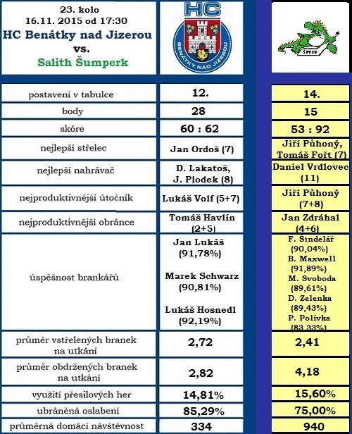 Hráče Benátek nad Jizerou čeká série tří domácích zápasů v řadě. V pondělí 16. 11. od 17:30 vyzvou draky ze Šumperku, následující den ve stejný čas Přerov a v sobotu je pak čekají kladenští Rytíři. Šumperk je v letošní sezóně beznadějně poslední s pouhými 15 body, letos vyhrál jen pětkrát, avšak z toho čtyřikrát venku. Benátky Slezany dokázaly v 10. kole porazit na jejich ledu vysoko 6:2, a tak doma budou Středočeši navazovat na tuto výhru.